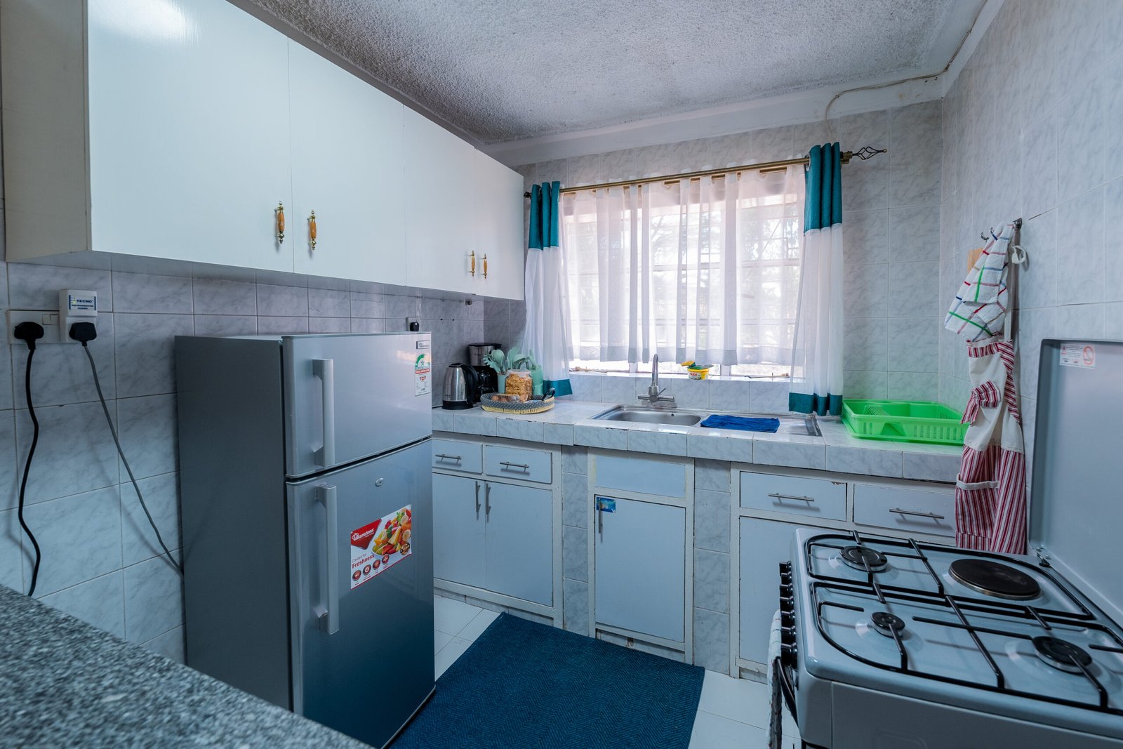 Fully equipped kitchen with fridge, gas cooker, microwave, kettle, toaster & more